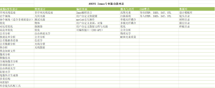 Ansys Zemax專業版的功能如下表所示: