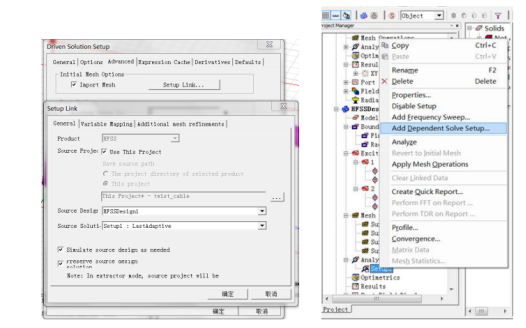方法 2,在原先求解設置項點擊右鍵設置 add dependent solve setup, 此設置省去導入指定設計的操作。此方法適用于多頻點寬帶掃頻仿真。如使用 2.5GHz 頻率下剖分后的網格作為5GHz求解頻率的初始網格,簡化剖分過程,快速能得到精確結果。