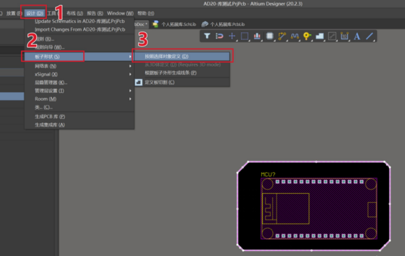 4.按照外框裁剪;步驟:設(shè)計(jì)→板子形狀→按照選擇對(duì)象定義 快捷鍵:D→S→D