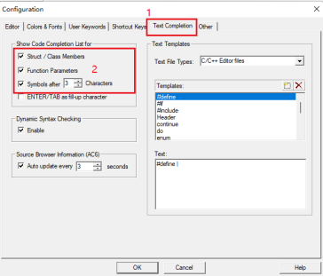2、然后單機標簽text completion,然后勾選第二個紅色框內的選項即可完成。第二個紅色框內,第一個選項struct/class members為結構體和類成員的自動補全。第二個選項function parameters是函數參數的自動補全,第三個選項symbols after ”num” characters為字符串的自動補全,中間的數字的設置你輸入幾個字符后出現匹配列表。