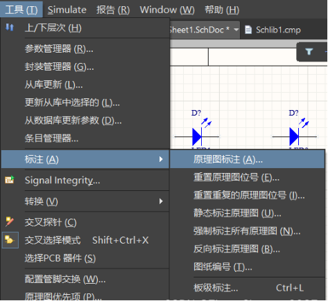 在菜單欄下執行“工具”→“標注”→“原理圖標注”的命令。