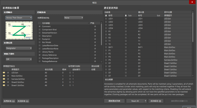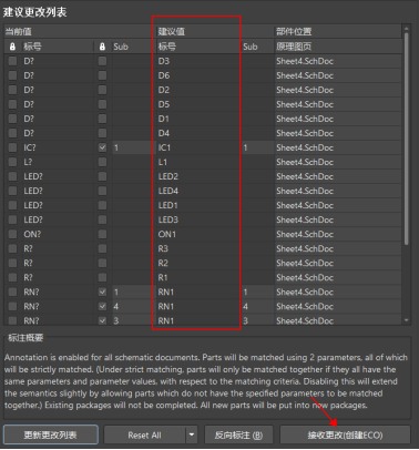 在窗口的右側,有一個建議更改列表,能夠看到目標原理圖中所有元器件標號情況。