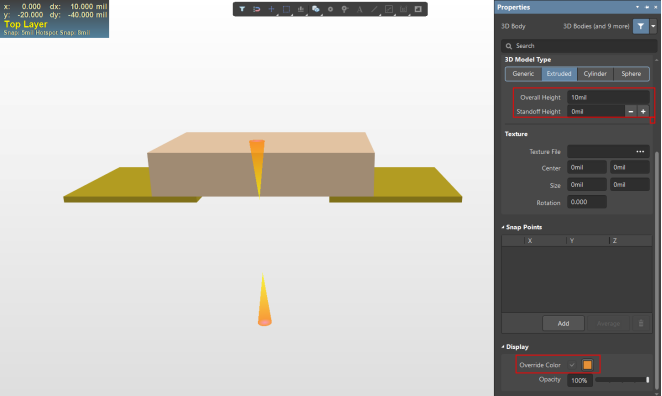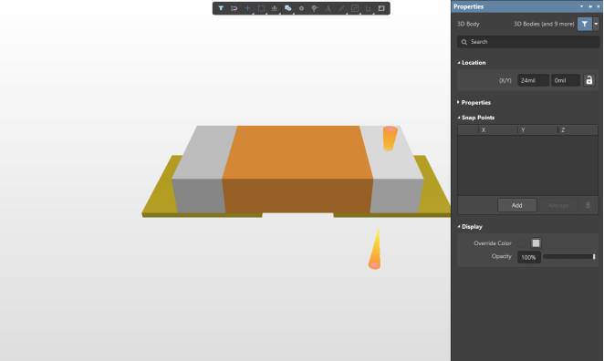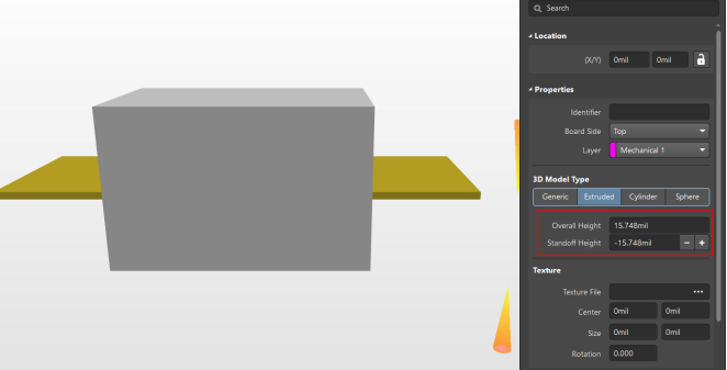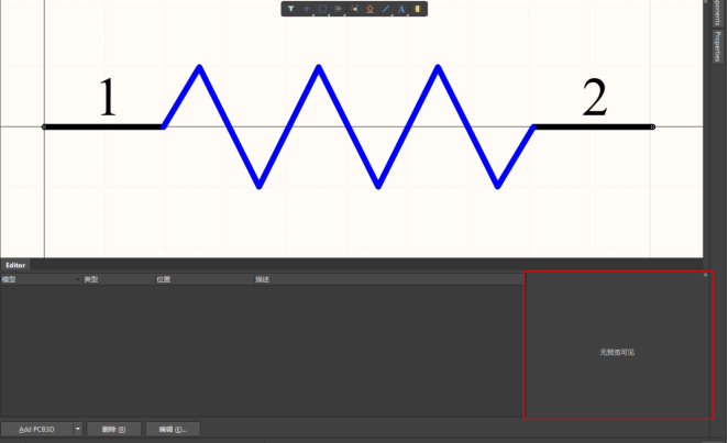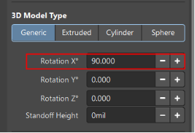 使用已有的3D體模型庫添加后,這個3D模型在XZ軸的二維平面中,需要圍繞X軸旋轉90°來調整到與焊盤在同一個平面中。調整擺放位置與整體大小即可。