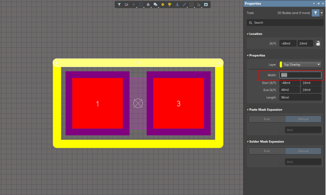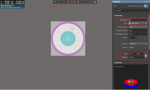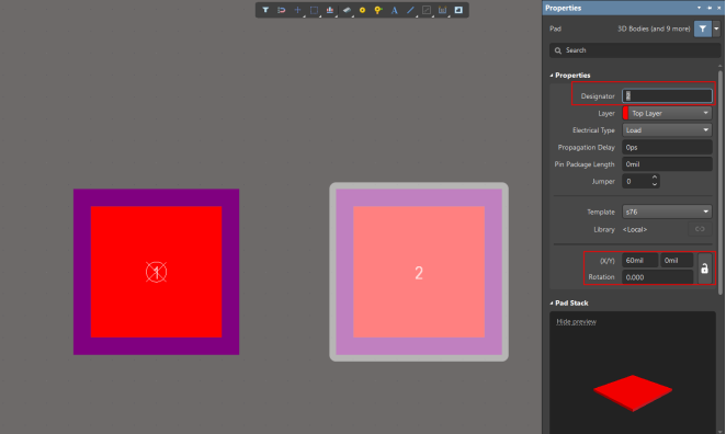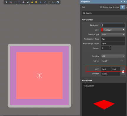 4.兩個焊盤重疊后,在屬性面板上修改位置信息。