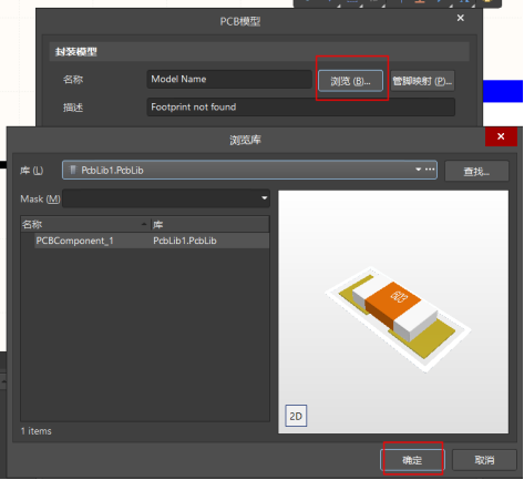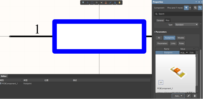 7.在該原理圖符號庫中,找到屬性面板中添加PCD封裝模型。