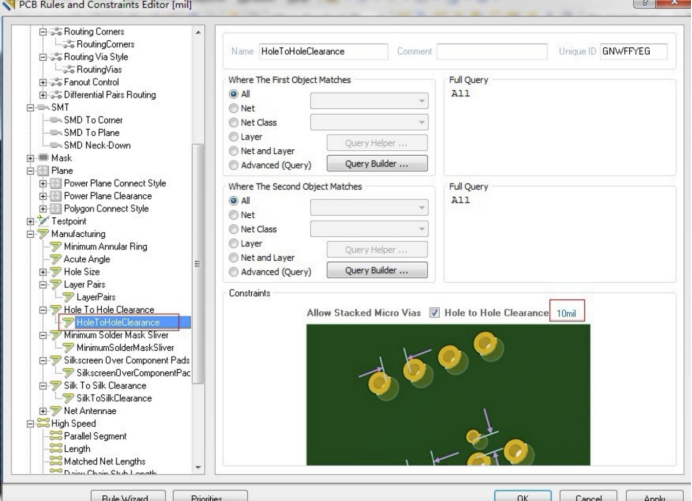 manufacturing>hole to hole clearance,把這個值設置的小一點,如圖10mil