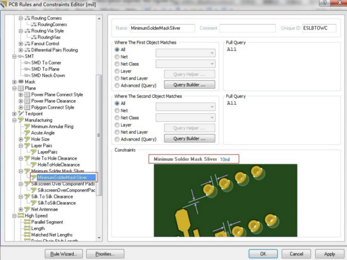 Minimum Solder Mask Sliver設置的小一點,如圖10mil