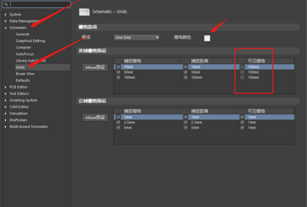 第二步, 點擊“Schematic”->"Grids".如果只想去掉柵格,可以直接將紅框框中的三個選項框取消勾選。如果還想設置為別的顏色背景,就選擇柵格顏色就行。