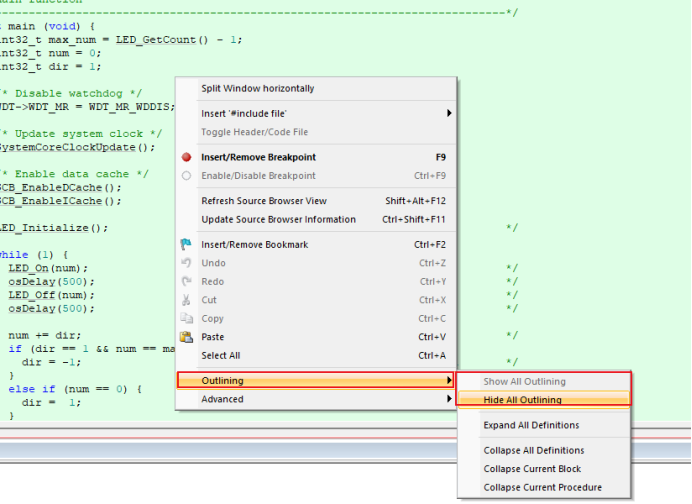 可以通過右鍵單擊,在菜單中找到outlining->Show All Outlining顯示大綱,或者點擊Hide All Outlining隱藏大綱。