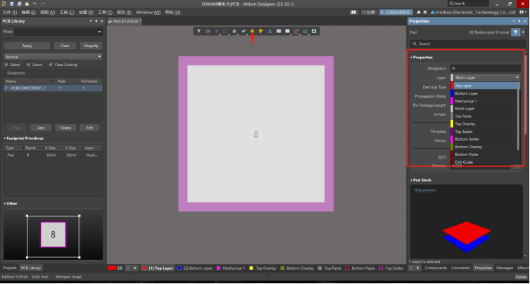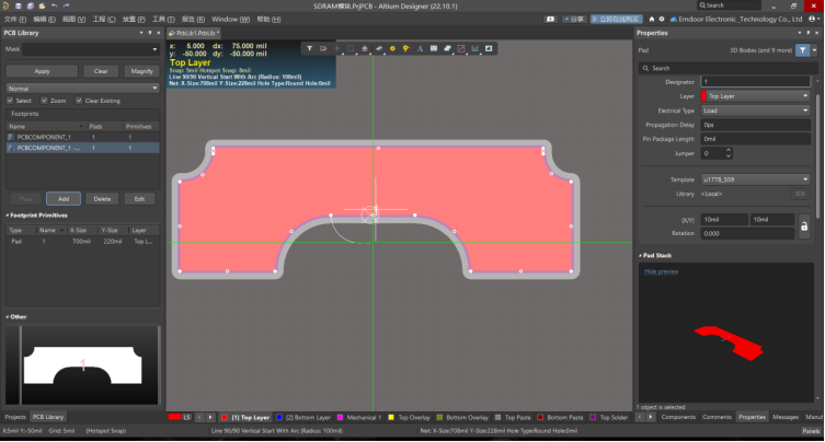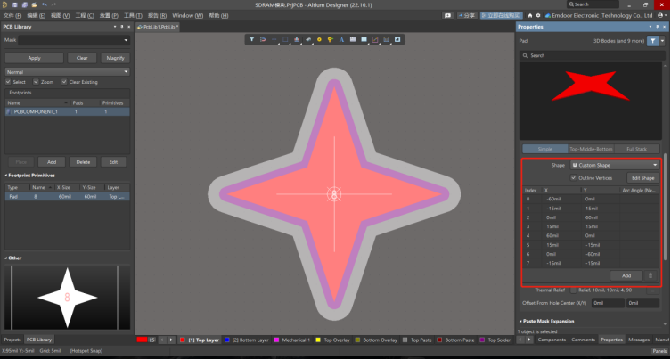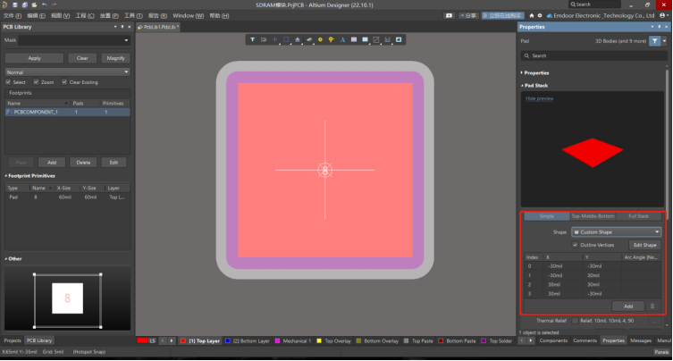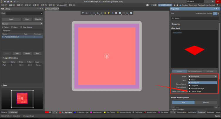 在屬性面板中修改焊盤的基本信息、層結構(Top Layer)。在焊盤形狀中有四種基本樣式和自定義樣式。接下來講解焊盤的自定義樣式設置。