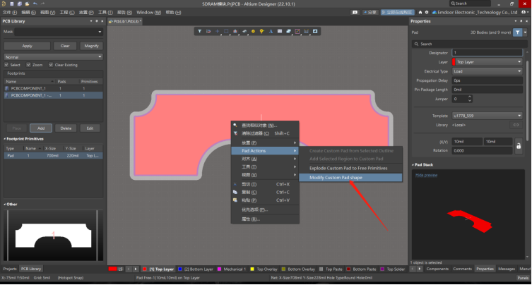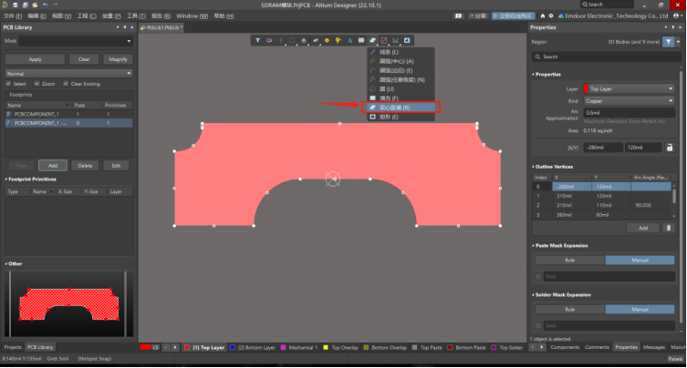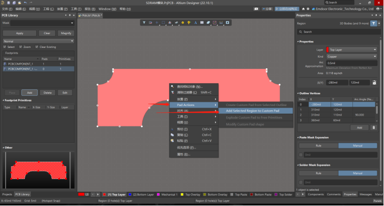 對繪制形狀右鍵點擊,【Pad?Actions】【Add Selected Region to Custom Pad】,將該區(qū)域快速創(chuàng)建為焊盤。