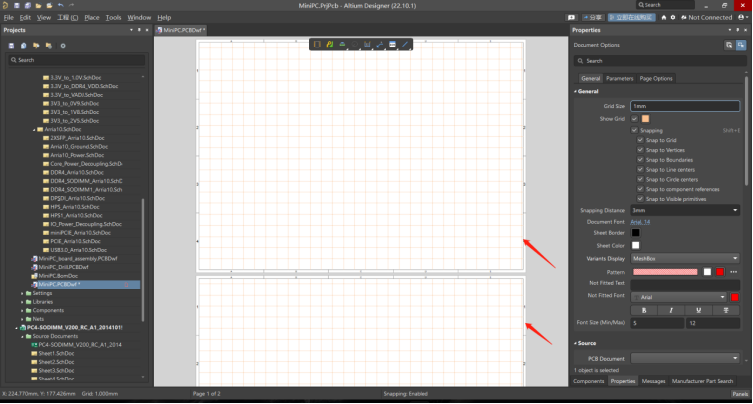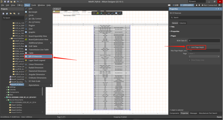 放置物料清單(BOM)后,可以看到物料數量多而無法全部顯示,雙擊打開屬性面板后,勾選Limit Page Height,設置長度“250”,復制后依次選擇頁數。