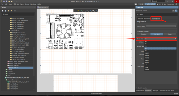 在屬性面板中“Page Options”下“Sheet Size”修改圖紙大小。