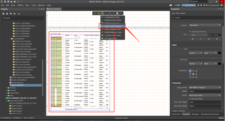圖層堆棧圖例視圖以放大剖視圖顯示了電路板的內部結構。它包括堆棧中每個層的詳細描述和信息,包括與每個層關聯的Gerber文件。