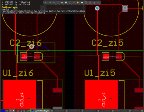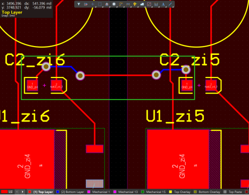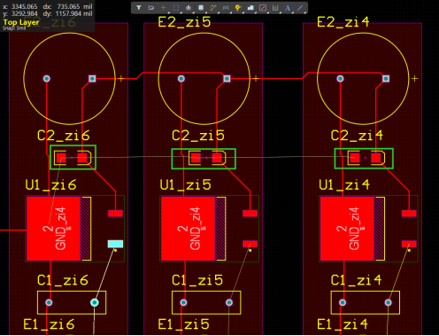 在給下面三個(gè)電容布線時(shí),在TOP層走線已經(jīng)無法通過時(shí),需要將走線通過換層(Bottom層)走線來避開。這里介紹一個(gè)快捷鍵的使用,不需要去手動(dòng)換層完成走線。