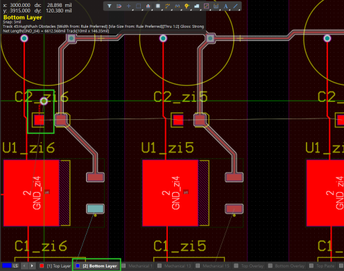 可以看到繼續(xù)走線時(shí),布線已經(jīng)來到Bottom層中。