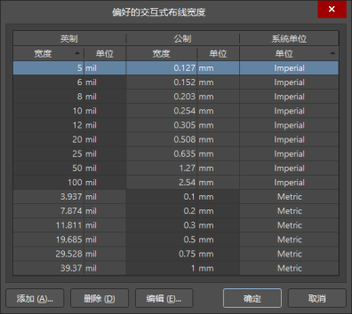 可以查看到預設的布線寬度,英制和公制相對應,可以更好的使用所需要的布線寬度。可以添加需要的線寬預設。