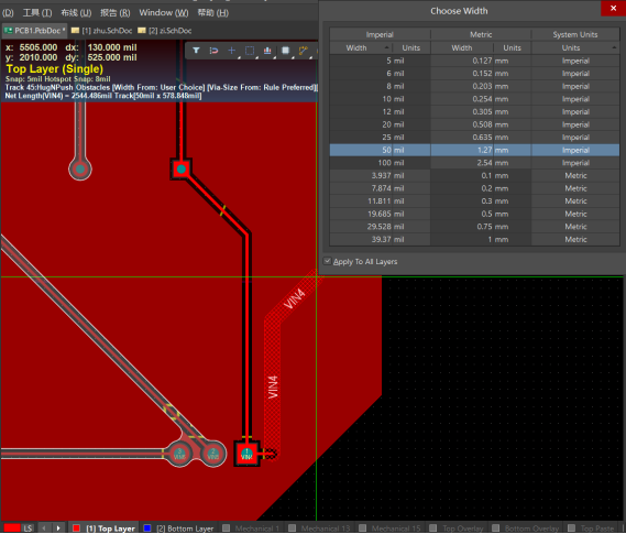 在交互式布線模式狀態下,用戶可以直接按快捷鍵Shift+W來調用布線寬度。選擇所需要的布線寬度。