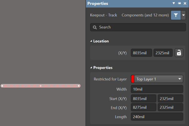 對于Keepout線,層的設置將決定該線對哪些層有效。通過層設置可以將Keepout線設置為Keep-Out層和當前PCB疊層結構中其他的布線層,并且顏色會變成對應層的顏色。如果設置在Keep-Out層,此線對所有布線層有效;如果設置為某一層(如Top),則只對當前層有效。