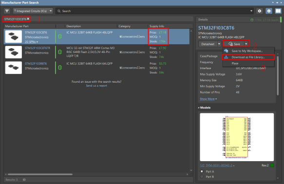 在【Search】搜索框中輸入STM32C8T6添加篩選條件,【Supply Info】信息欄下有價(jià)格和庫存等信息。