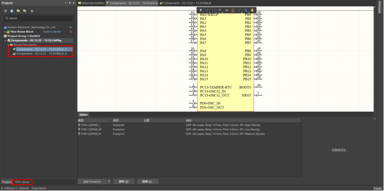 打開后就可以看到原理圖庫文件和封裝庫文件。