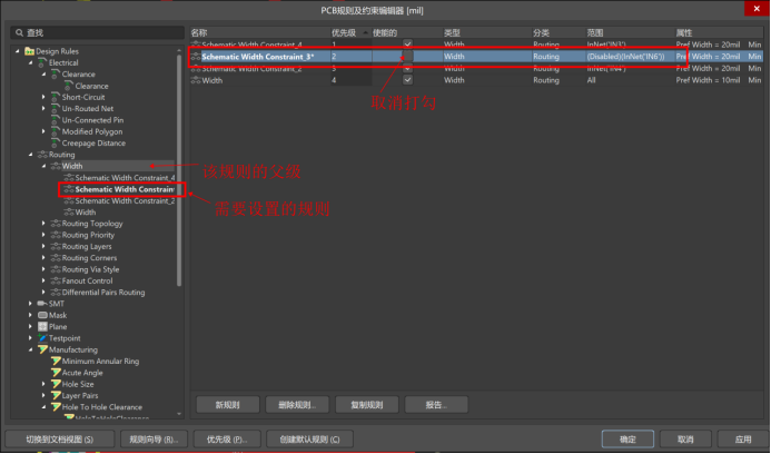 在PCB設計中,在規則約束器中可以新建需要的和刪除不需要的規則。在某些情景下,對于個別規則暫時不用,又不想刪除,就可以設置該規則不啟用來實現。
