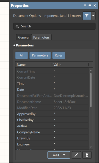 在不選擇任何對象的情況下,打開屬性框,此時顯示的是原理圖圖紙的屬性,點擊Parameter條目,可以看到當前圖紙的各種參數名稱以及參數值。