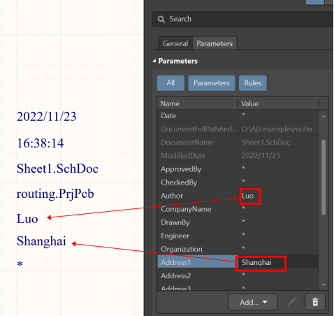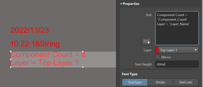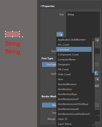 需要注意的是,PCB中支持多個參數放在一個字符串中,如果需要在一個字符串中顯示多個參數,進行多次選擇即可,每個參數的開頭和結尾都有‘’,注意不同參數間的區分,以免造成顯示異常。