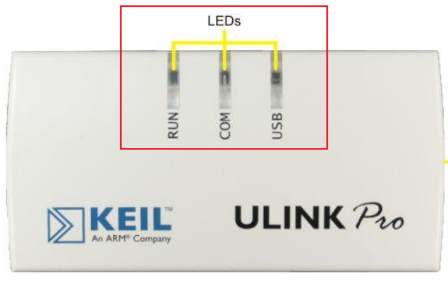 ULINK Pro上面一共有三個LED燈,并且每個燈都有了對應的標注。這里對于三個燈的含義進行說明: