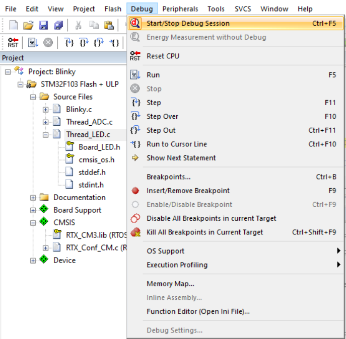 1 在菜單點擊 “Debug”-->“Start/Stop Debug Session”