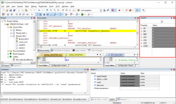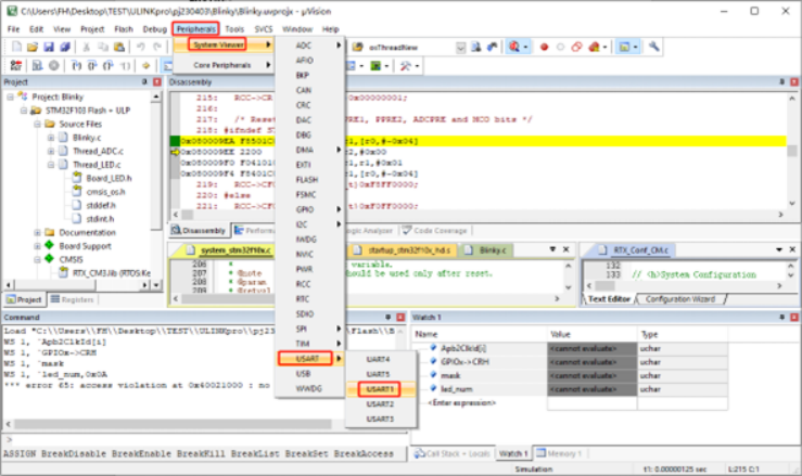 2 在調試界面中,打開“Peripherals”--> “System Viewer”選擇一個外設,比如USART--> USART1