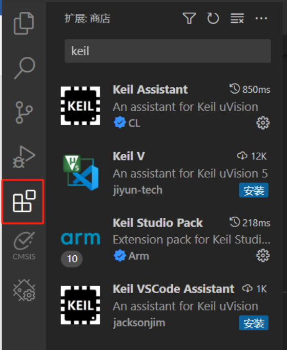 1 打開VS code點擊擴展欄,在搜索框中輸入keil。可以看到有一個“Keil Assistant”的插件。