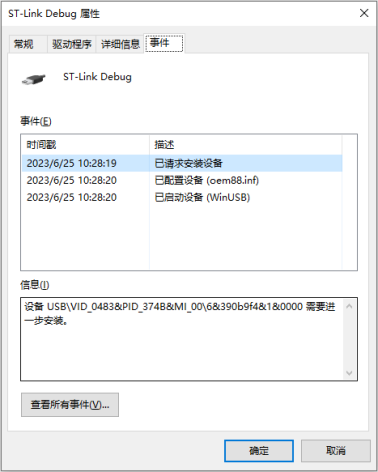 2 ?雙擊這個條目,在事件標簽下可以看到“設備 USBVID_0483&PID_374B&MI_006&390b9f4&1&0000 需要進一步安裝。”如果最后串字符“6&390b9f4&1&0000”超過32個則會導致μVision IDE閃退。