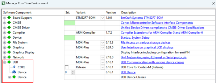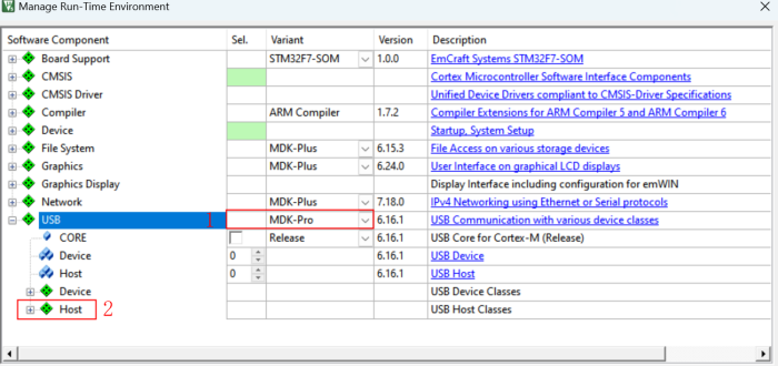 Keil MDK的Pro版中的“Manage Run-Time Environment”管理器中,沒有Usb Host中間件組件的選項,如圖2-1所示: