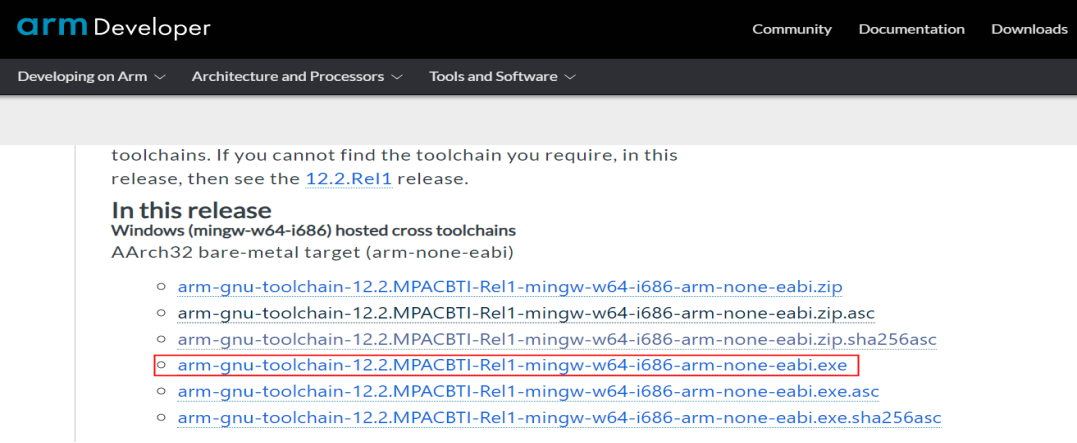 1)從ARM的官網“https://developer.arm.com/downloads/-/arm-gnu-toolchain-downloads”下載對應的Arm GNU Toolchain,如圖4-1所示: