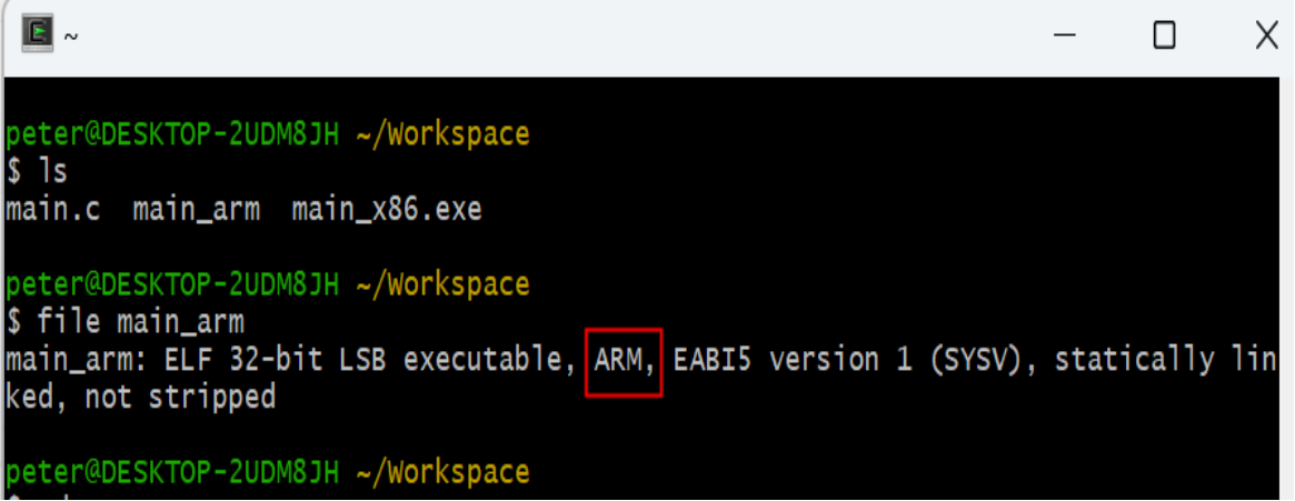 6)在工作目錄下,創建一個“.c”的Helloworld的源程序,通過“arm-none-eabi-gcc -o main_arm main.c -lc --specs=nosys.specs”編譯出可以執行文件,如圖4-6所示: