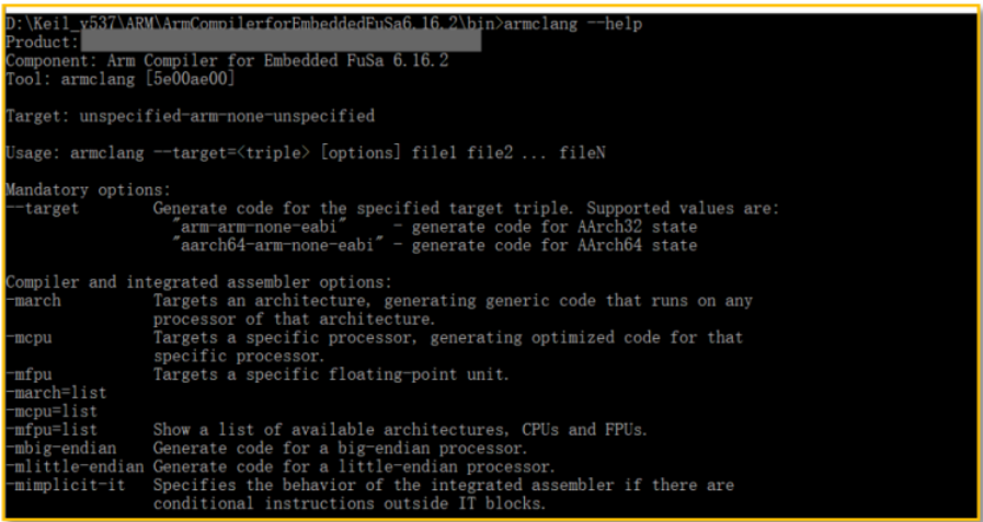 2)驗證授權許可:在 cmd 窗口中切換到arm 編譯器路徑,輸入編譯器名稱并回車。比如: armclang --help。
